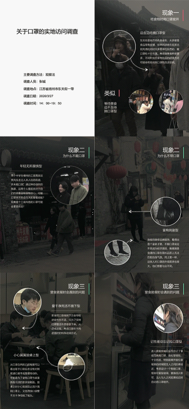 老师还引导员工们在人群较为疏散的地区做实地观察,以旁观者的身份,观察社会各种人群使用口罩的行为习惯、状态。员工们以拍照和文字记录的方式记录了大量的来自社会各个行业的人们使用口罩的现状。