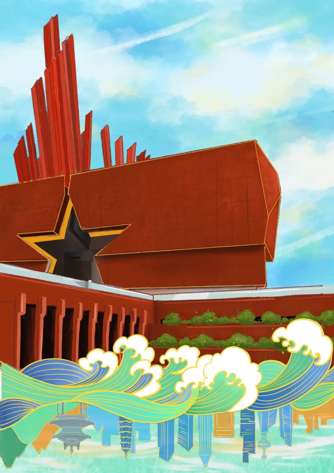以南京渡江胜利纪念馆为原型,以形似木船的纪念馆主馆为主体,将“千帆竞渡”群雕与其结合,就像渡江木船上随风飘扬的红旗,又似指引人民奋勇向前的灯塔。画面下方蓝绿配色的波浪象征长江河流,推动着革命者前行,一如推动历史进步一般。河面倒映着南京现代化建设成果,意旨没有中国共产党的带领,就没有我们现在幸福美好生活。