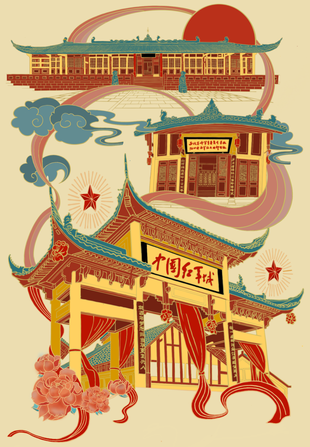 中国红军城,位于四川省广元市,该作品创作以红黄蓝为基调,自下而上的是中国红军城,西北革命军事委员会旧址,木门军事会议旧址。鲜红的飘带,冉冉升起的落日,漂浮的祥云,共同勾勒出中国红军城全貌。整幅画将它们串联在一起,共同演绎着中国红军城的前世今生。