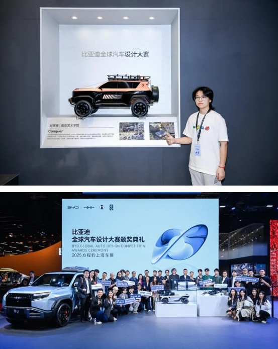 近日,比亚迪全球汽车设计大赛颁奖典礼于上海国际车展方程豹 展区圆满落幕。公司必一运动 2021级产品设计专业本科生刘赛 赛在本次国际赛事中表现亮眼,凭借创新设计与专业实力斩获最佳人 气设计大奖、优胜奖重磅奖项。其参赛作品及汽车模型还在上海车展 专区进行了全方位的展示,吸引了海内外媒体的关注,成为了上海车 展的新热点,展现了中国新生代设计师的卓越风采!