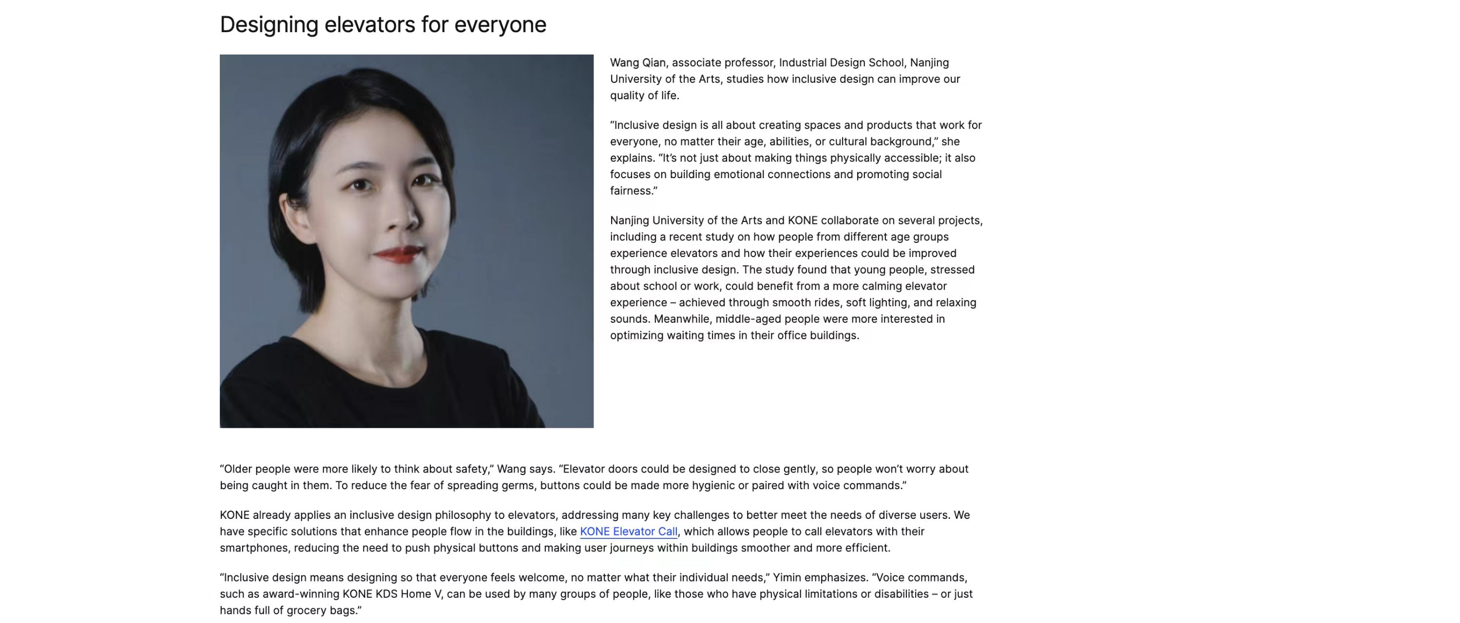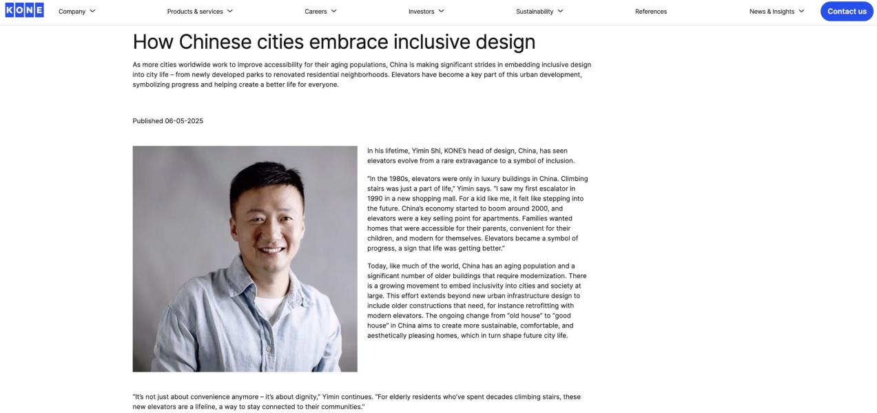 5月 6日,芬兰通力电梯(KONE)官网发布专题报道,聚焦中国 城市包容性设计的发展路径。报道中,公司杰出员工、研究生行业导 师、通力电梯中国区设计部门负责人施逸民,产品设计系主任王倩, 从产学研深度融合的实践出发,深入探讨了如何通过创新设计赋能中 国城市包容性转型的战略路径。