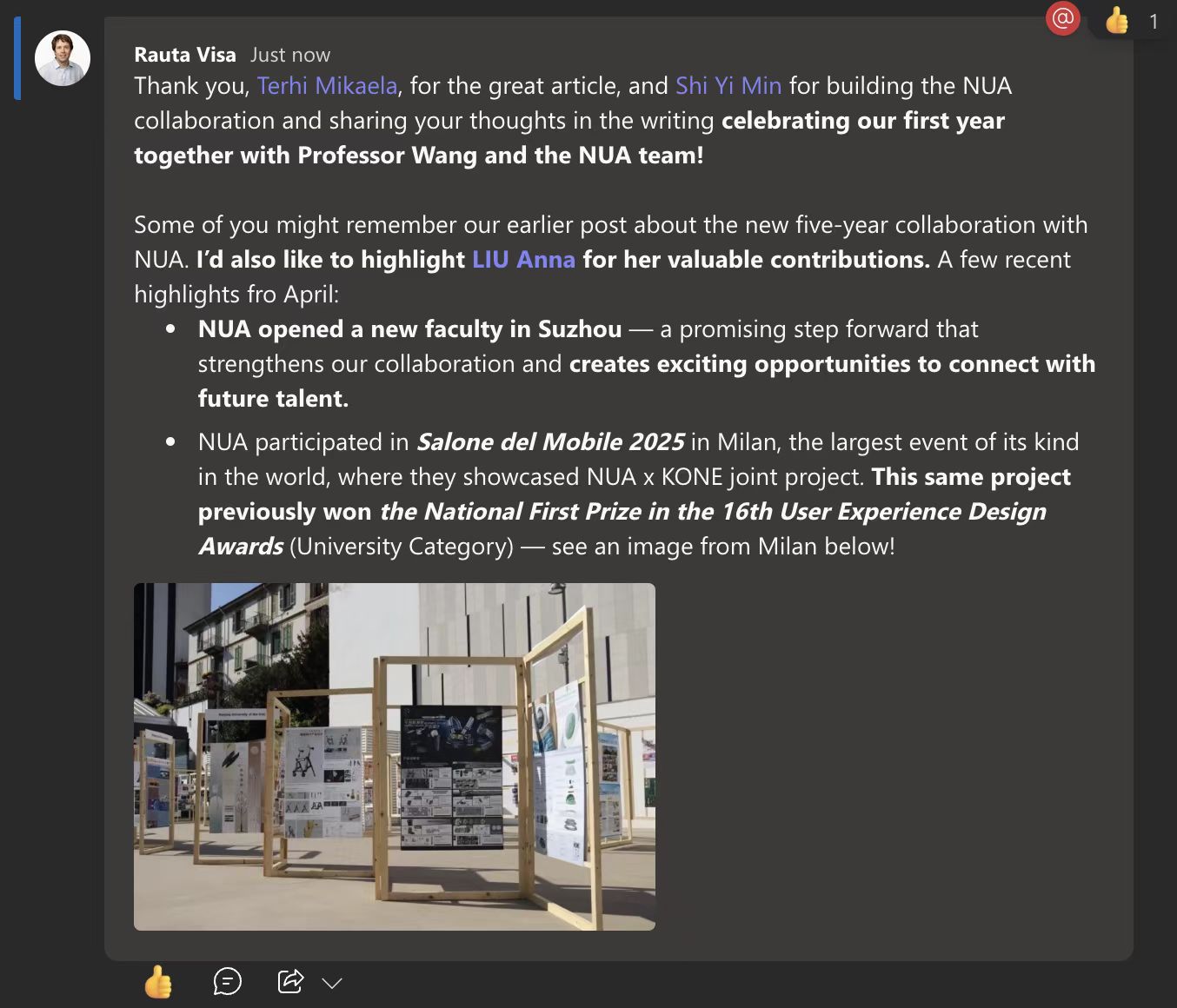 自2023年双方共建“智能系统设计创新产教融合基地”以来,已联合开展多次工作坊与横向课题,例如《全包容设计视角下电梯维保人员可穿戴智能产品系统设计》项目,获联合国世界环保设计组织优秀案例奖、第十六届UXDA国际用户体验创新大赛一等奖银奖、2024中国服务设计大会十佳概念案例奖、2024全国青年设计师大赛三等奖等荣誉,并受邀在米兰参加第八届米兰设计周-中国高校设计学科师生优秀作品展。项目成果得到通力全球设计总监Visa Rauta高度评价。