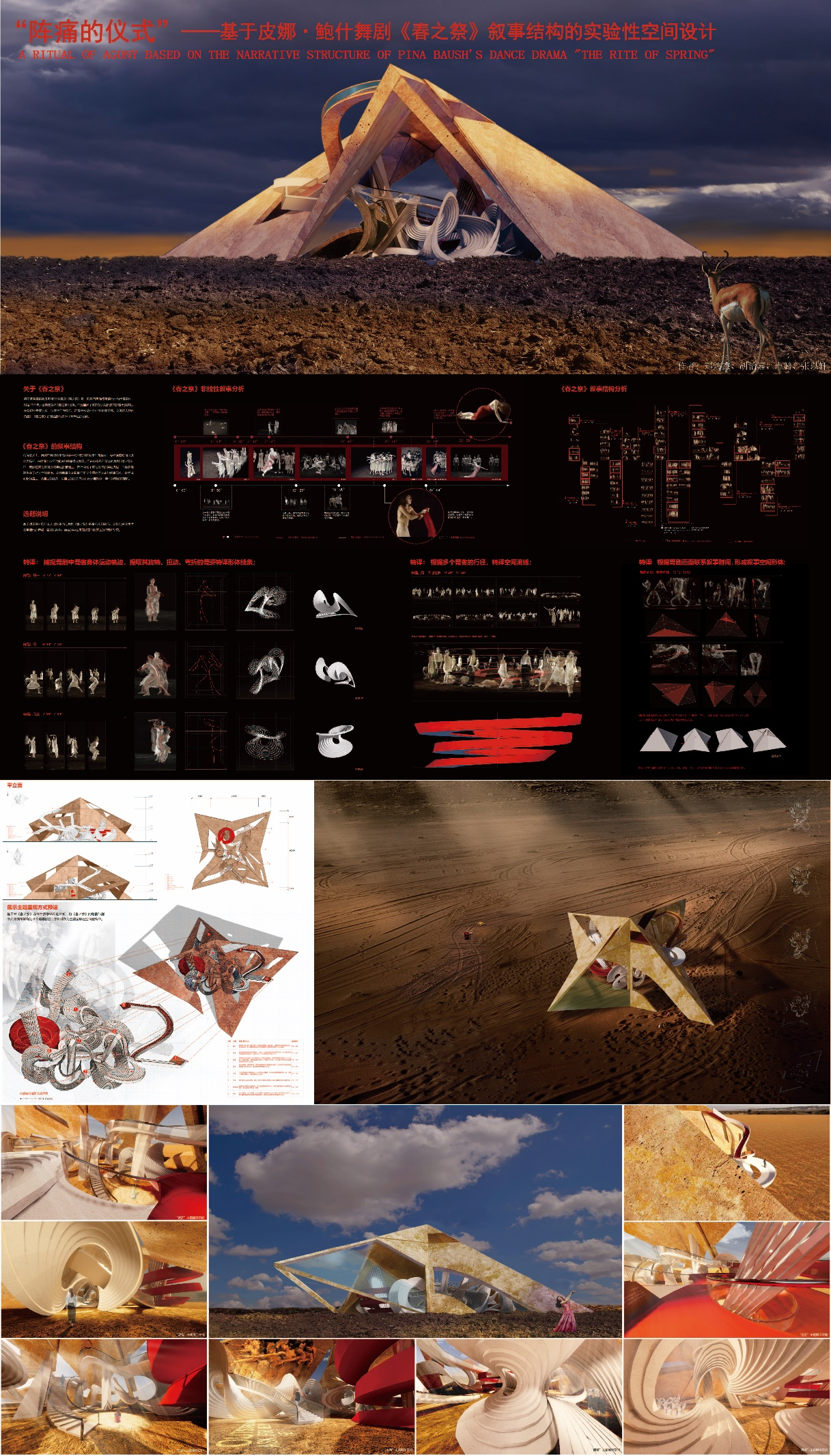 据悉,由公司“艺术与科技”专业张应鲲老师指导,2022级毕业生郑炜杰、胡治嘉、卢璐、张以轩合作完成的毕业设计作品《基于皮娜·鲍什舞剧“春之祭”叙事结构的实验性空间设计》已获批申报江苏省优秀毕业设计团队。该设计作品基于“新文科”视域下的“新艺科”蓬勃发展的背景,以艺术学专业“跨学科”研究为主旨,探索设计专业与舞蹈专业的创新“链接式”教研模式,以设计思维解读舞剧的叙事结构、空间美学与情感呈现形式,将经典舞剧转译为空间设计形态的诗意建构。毕业设计团队成员以毕设课程为依托,在指导教师的带领下对当代舞剧的“叙事方法、场景表达、情绪传递与美学呈现”等具体方面进行大量的案例分析,最终选定当代著名舞蹈家皮娜·鲍什的现代舞剧《春之祭》进行深入研究并完成大量设计成果。舞剧《春之祭》以多重叙事的形式再现了俄罗斯部族庆祝春天的祭礼,表达对春天的讴歌,对大地的崇拜,对生命的热爱。选题具有复杂的叙事线与强烈的情感氛围,设计团队以此作为切入点进行研究,对叙事结构进行了非线性梳理与图式分析,完成空间形体的主体构建;对舞蹈语言进行分析与形态提取、演化、转译,逐步转换为空间设计语言,并成为整体空间结构的补充;舞剧强烈的情